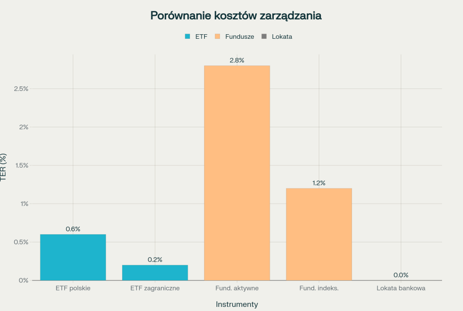To właśnie niskie koszty są jedną z głównych przewag ETF-ów. Średni wskaźnik kosztów całkowitych, czyli Total Expense Ratio (TER), w przypadku funduszy ETF wynosi globalnie około 0,24% rocznie. Dla porównania – aktywnie zarządzane fundusze inwestycyjne w Polsce potrafią pobierać od 2 do nawet 3% rocznie. Ta różnica może nie wydawać się duża, ale w perspektywie kilkunastu lat inwestycji ma kolosalne znaczenie.